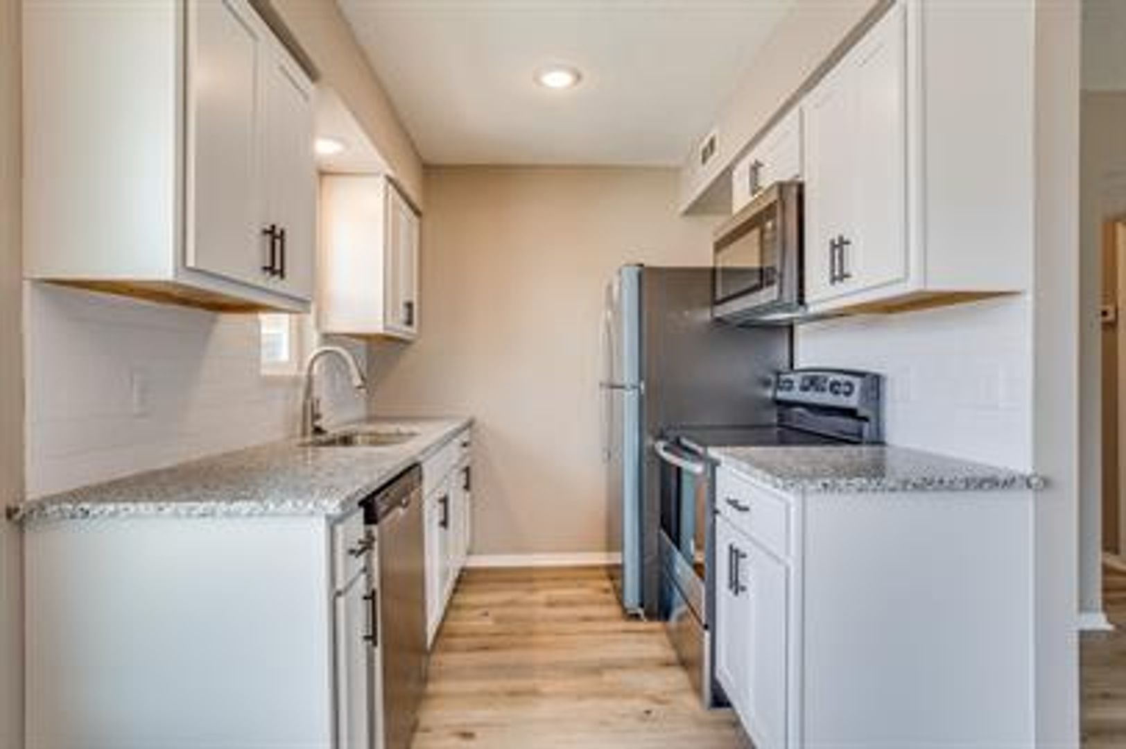 Kitchen Appliances Provided: Stove, Microwave, Dishwasher, Refrigerator.